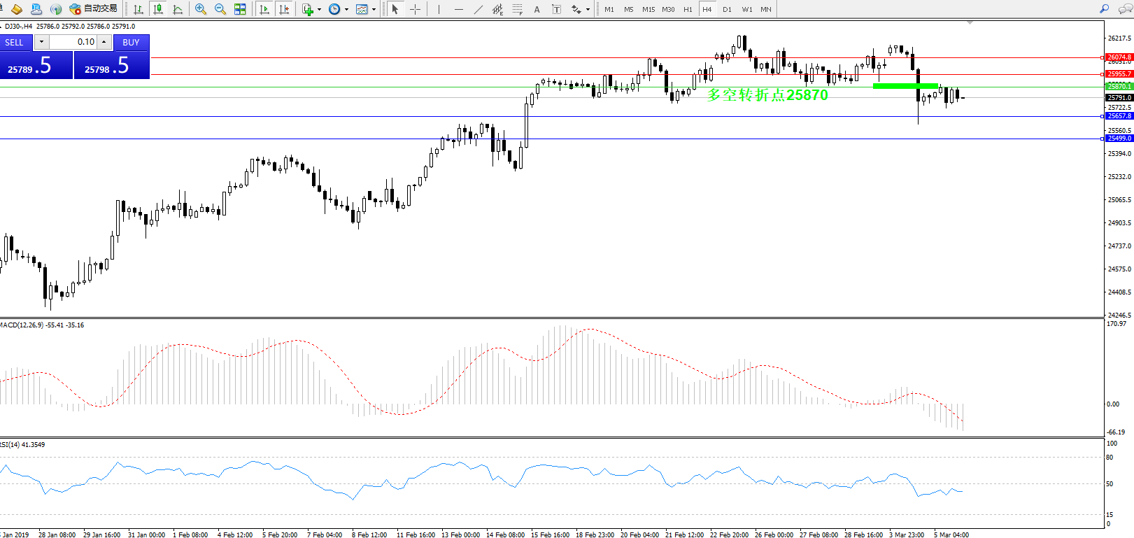 道琼斯指数DJ30—— 4小时K线图显示: