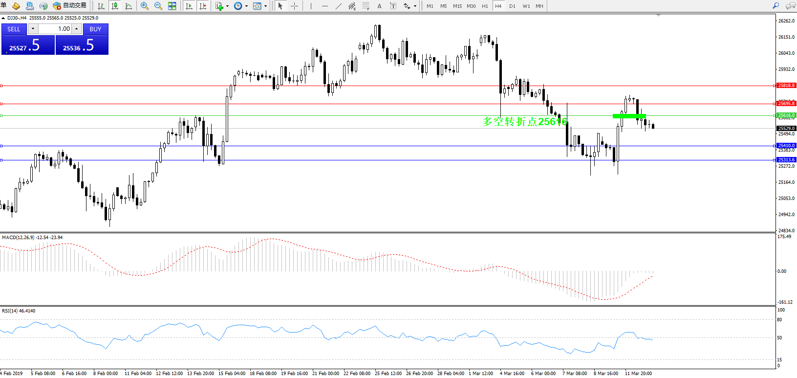 道琼斯指数DJ30—— 4小时K线图显示: