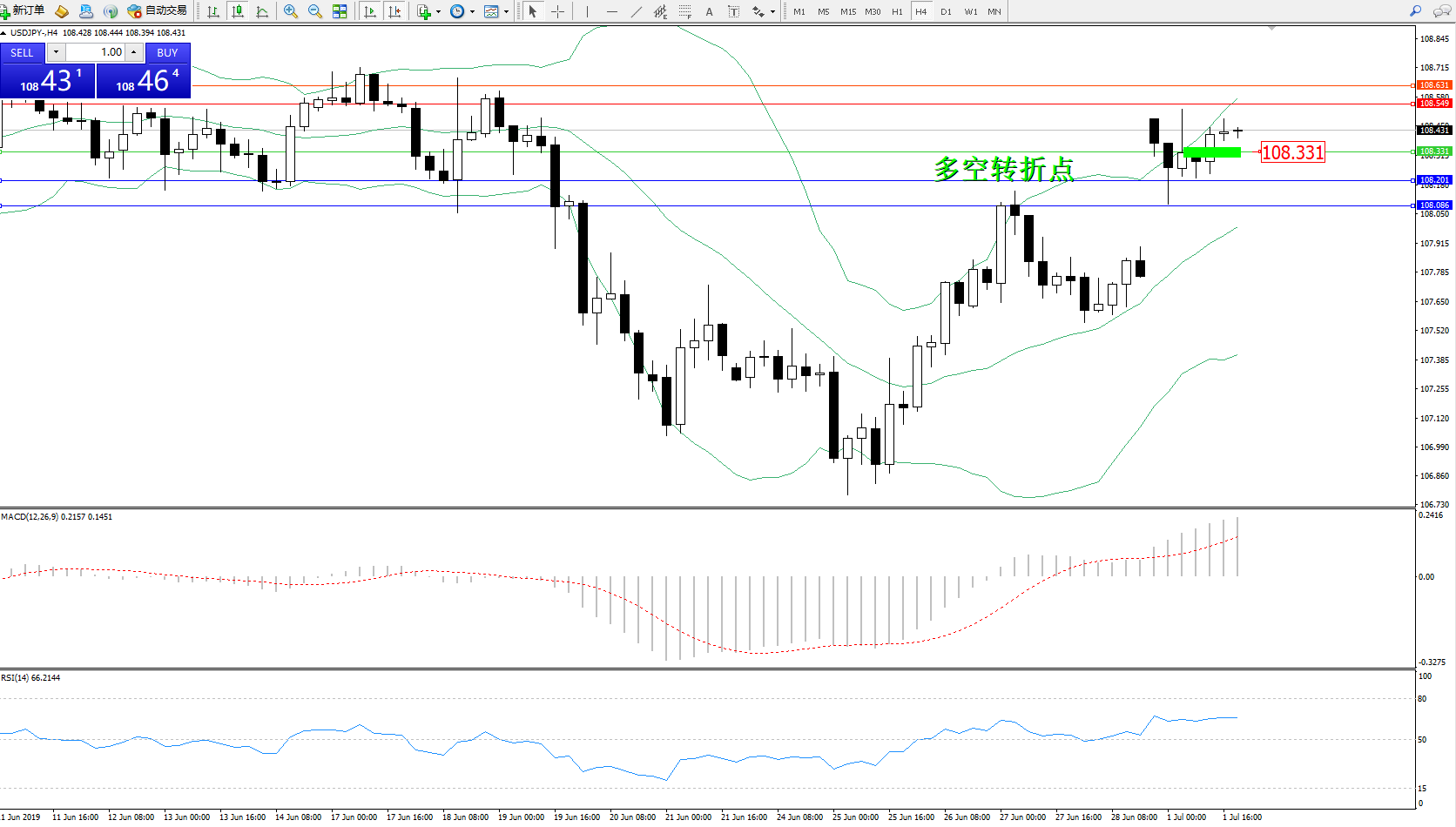 交易策略:108.331上方看涨,目标108.549、108.631