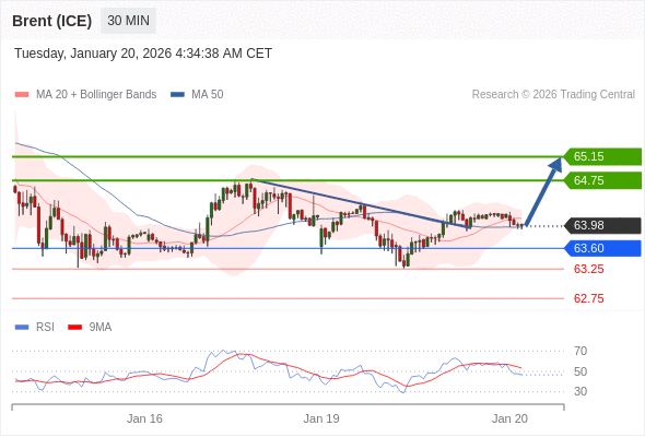 布伦特原油 (ICE) (H6) 当日内: 在63.60之上,看涨。