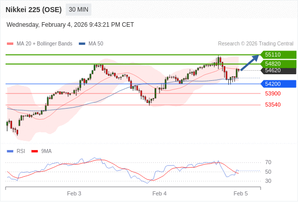 在 54200 之上,看涨,目标价位为 54820 ,然后为 55110 。