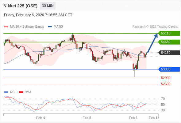 交易策略: 在 53330 之上,看涨,目标价位为 54680 ,然后为 55110 。
