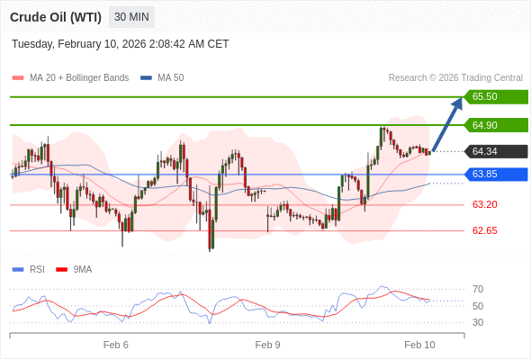 在 63.85 之上,看涨,目标价位为 64.90 ,然后为 65.50 。