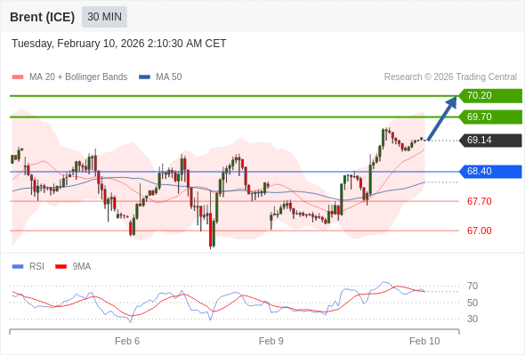 在 68.40 之上,看涨,目标价位为 69.70 ,然后为 70.20 。