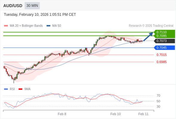在 0.7045 之上,看涨,目标价位为 0.7095 ,然后为 0.7110 。