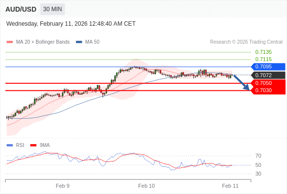 交易策略: 在 0.7095 之下,看跌,目标价位为 0.7050 ,然后为 0.7030 。