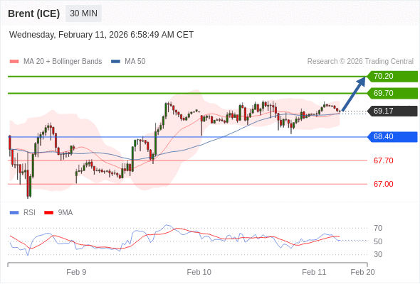 在 68.40 之上,看涨,目标价位为 69.70 ,然后为 70.20 。