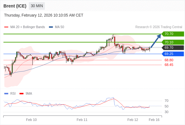 在 69.25 之上,看涨,目标价位为 70.10 ,然后为 70.70 。