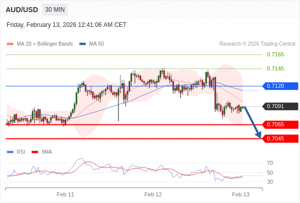 交易策略: 在 0.7120 之下,看跌,目标价位为 0.7065 ,然后为 0.7045 。