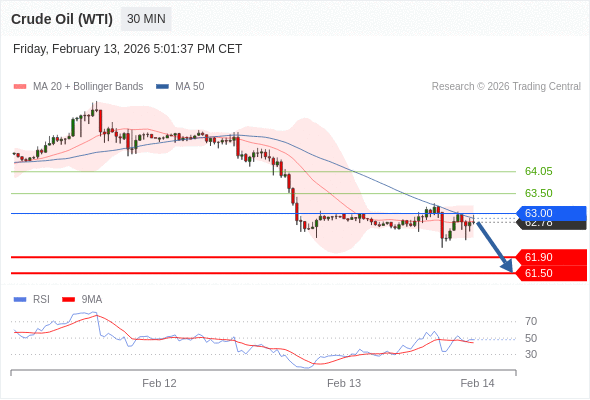交易策略: 在 63.00 之下,看跌,目标价位为 61.90 ,然后为 61.50 。