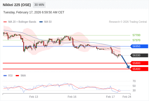 在 56950 之下,看跌,目标价位为 55800 ,然后为 55400 。
