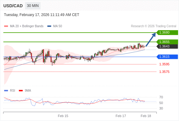 在 1.3615 之上,看涨,目标价位为 1.3655 ,然后为 1.3680 。