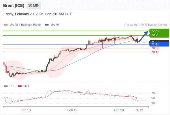 在 71.10 之上,看涨,目标价位为 72.25 ,然后为 72.80 。