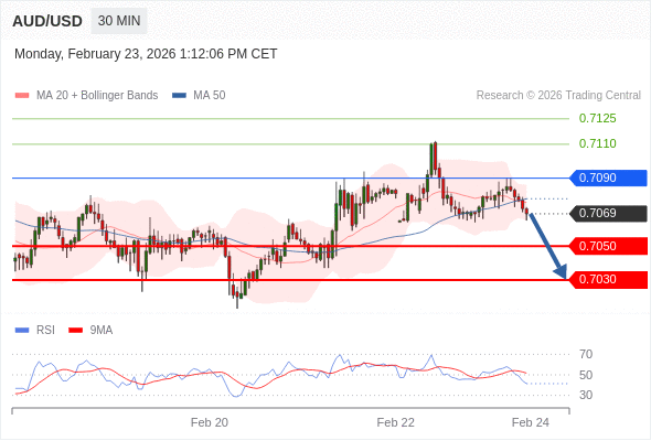 交易策略: 在 0.7090 之下,看跌,目标价位为 0.7050 ,然后为 0.7030 。