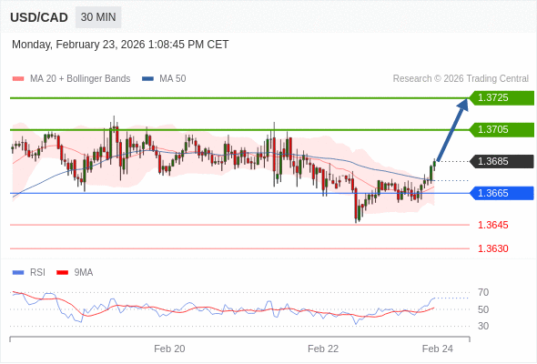 在 1.3665 之上,看涨,目标价位为 1.3705 ,然后为 1.3725 。