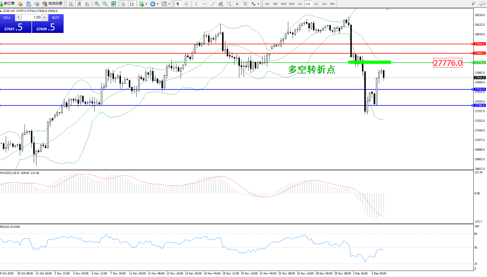 道琼斯指数DJ30—— 4小时K线图显示: