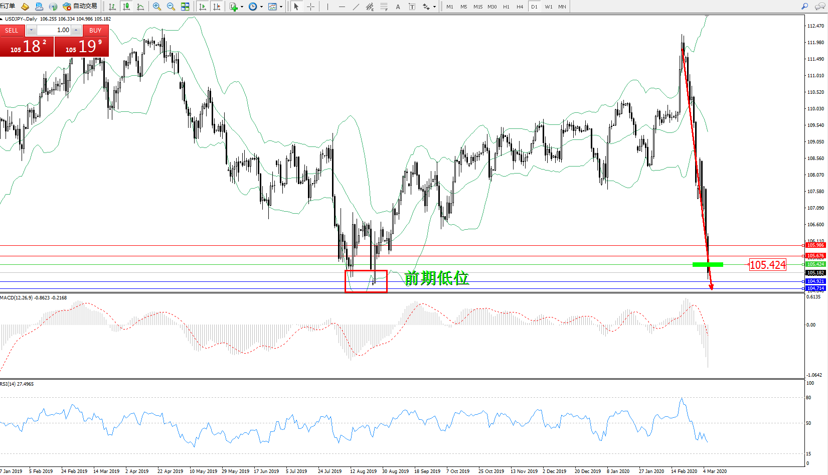 交易策略:105.424下方看跌,目标104.921104.714
