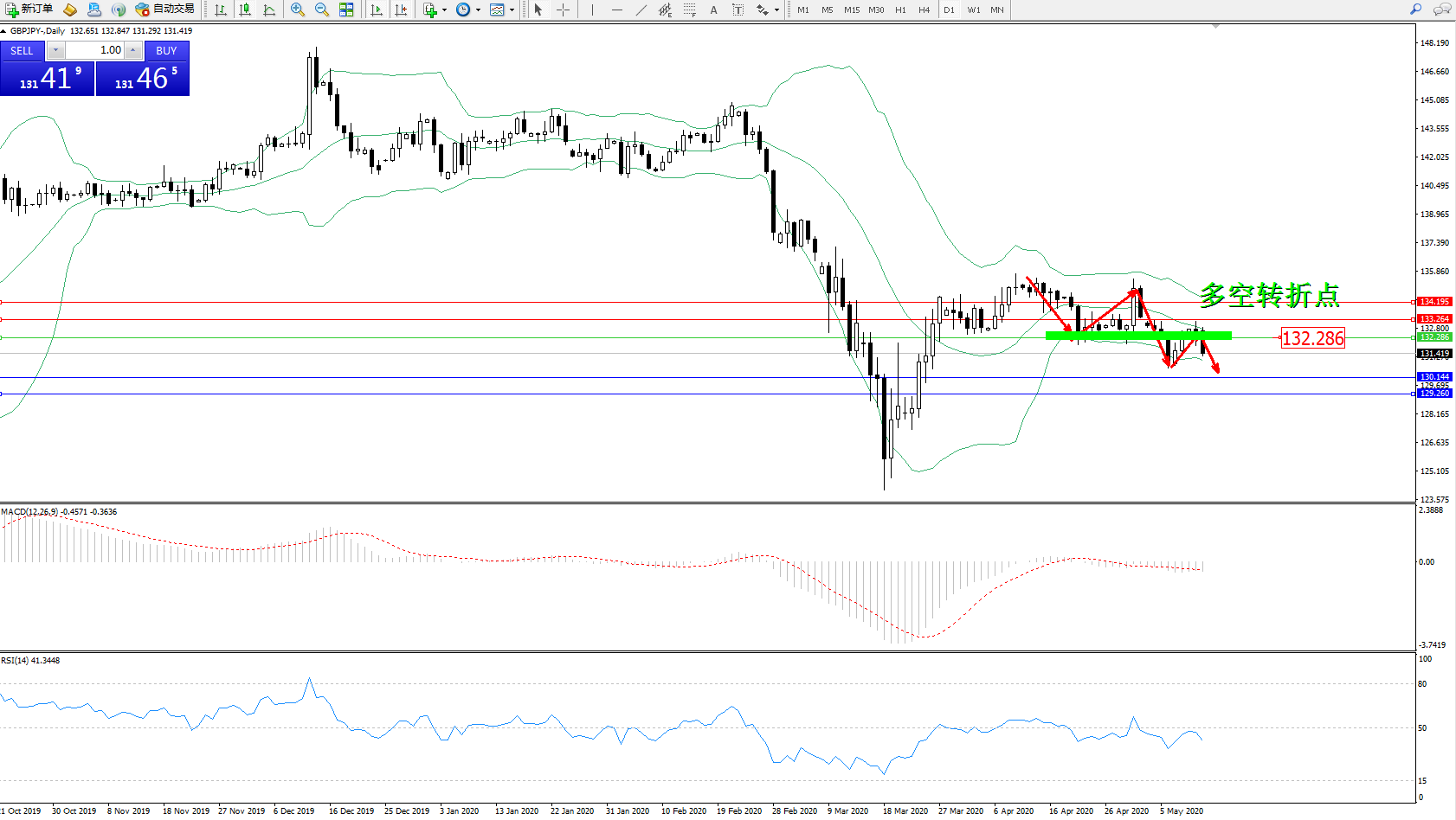 交易策略:132.286下方看跌,目标130.144、129.260