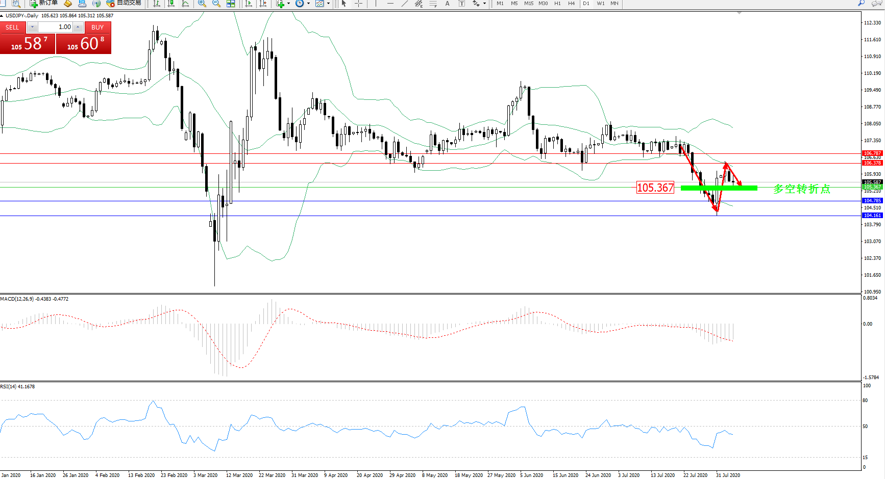 技术点评:高位空头动力延续布林带指标下轨持续弱势下行数日后,低位抵达104.161附近出现快速回升至布林带指标中轨附近整理,触及中轨后开始再度弱势下移,抵达转折点附近开始徘徊,布林带指标呈张口走势后以后收口迹象且下行趋势有形成态势,MACD指标处于0轴线下方空头区域弱势整理震荡下移后开始平移,RSI指标处于空头动力持续震荡下移后出现快速拉升走势;