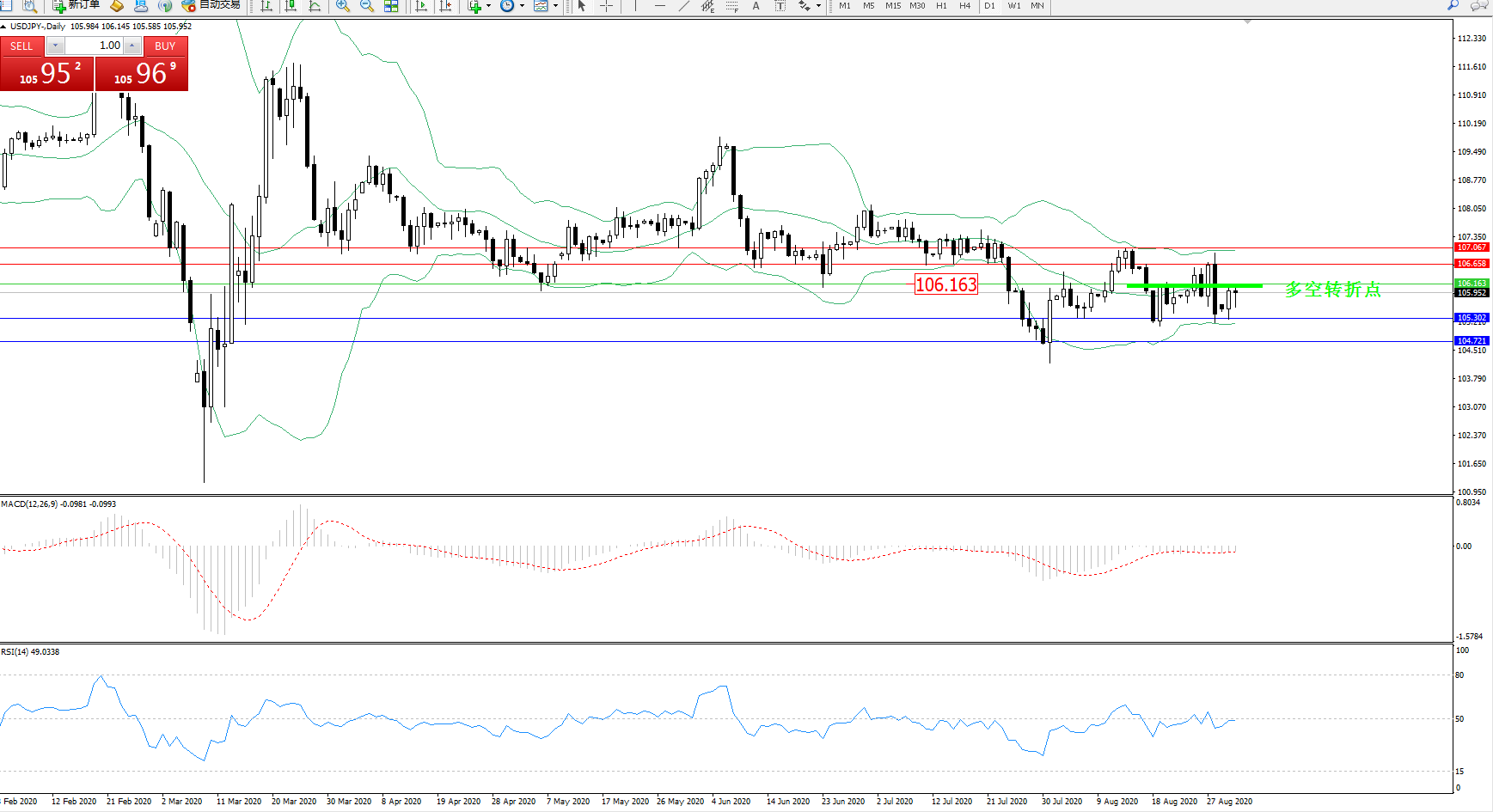 交易策略:106.163下方看跌,目标105.302、104.721