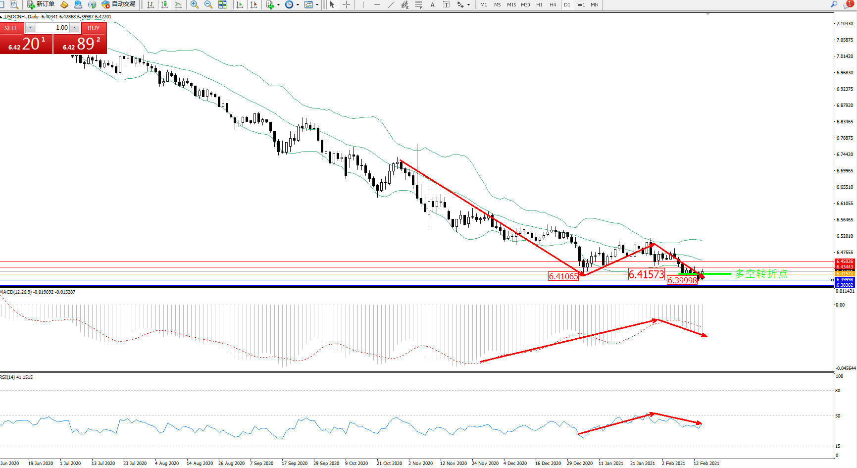 技术点评:空头动力长时间维持在底部窄幅整理持续平移中,前期低位6.41065位置破位后维持窄幅整理走势,低位抵达6.39998附近徘徊,布林带指标呈弱势整理缓慢张口走势后开始平移,跌势向下移动有减弱迹象,MACD指标处于0轴线下方空头区域弱势整理下行中,RSI指标处于50均衡线下方空头区域维持整理平缓移动中;
