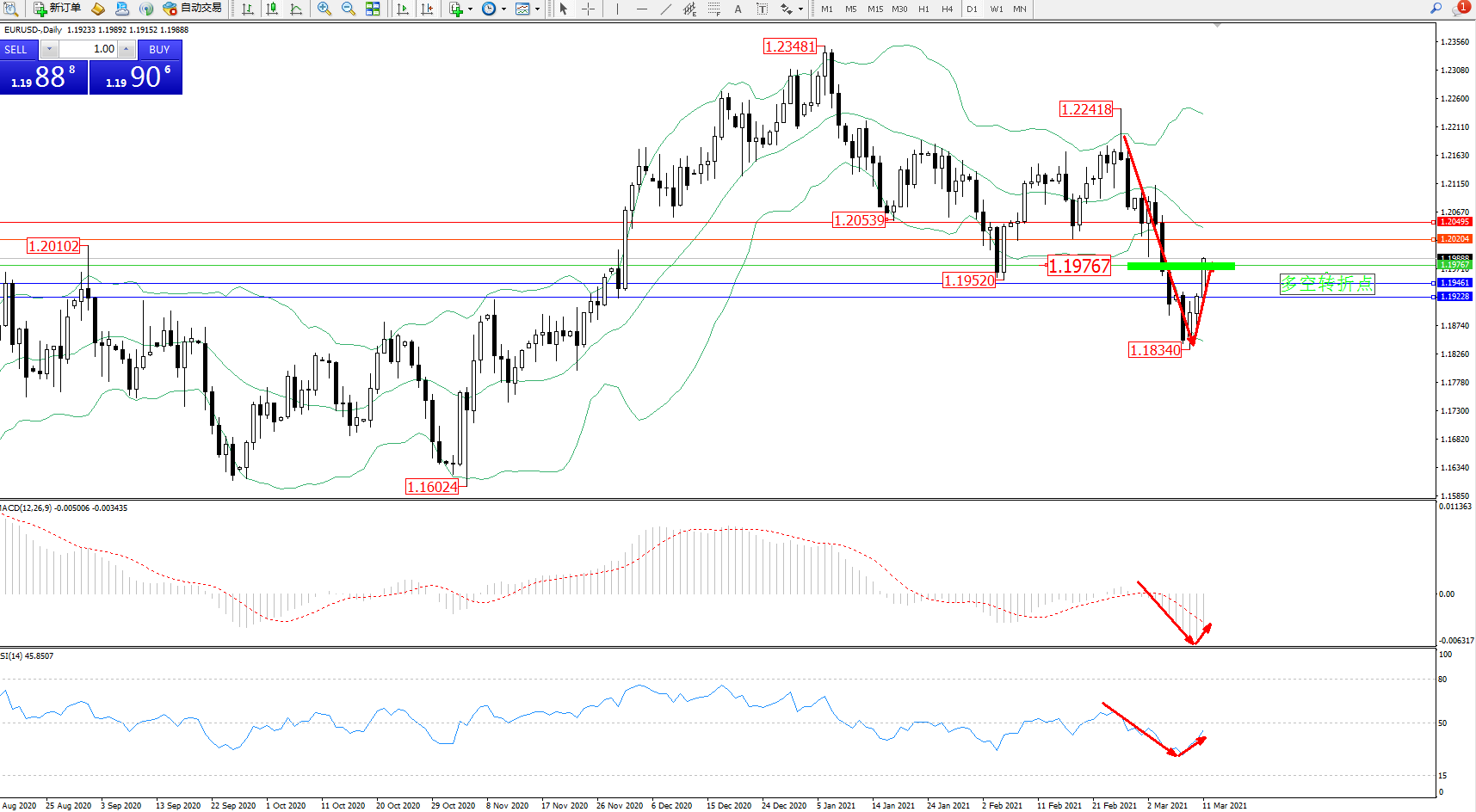 欧元兑美元低位多头上移至1.19846附近震荡,欧洲央行维持三大关键利率不变,符合市场预期;欧洲央行随时准备适当地调整其所有工具,以确保通胀以一种持续的方式朝着其目标移动,符合其对对称的承诺;将至少在2022年3月底前进行PEPP净购买;欧洲央行将继续在紧急抗疫购债计划(PEPP)下进行净资产购买,总规模为1.85万亿欧元,至少到2022年3月底;基于对融资条件和通胀前景的联合评估,欧洲央行预计下一季度购买PEPP的速度将显著高于今年头几个月;将继续通过其再融资操作提供充足的流动性,下个季度的购买力将大幅提高;欧洲央行预计利率将保持在当前或更低的水平,直到看到通胀前景强劲地趋同于一个足够接近,但在其预期范围内低于2%的水平。