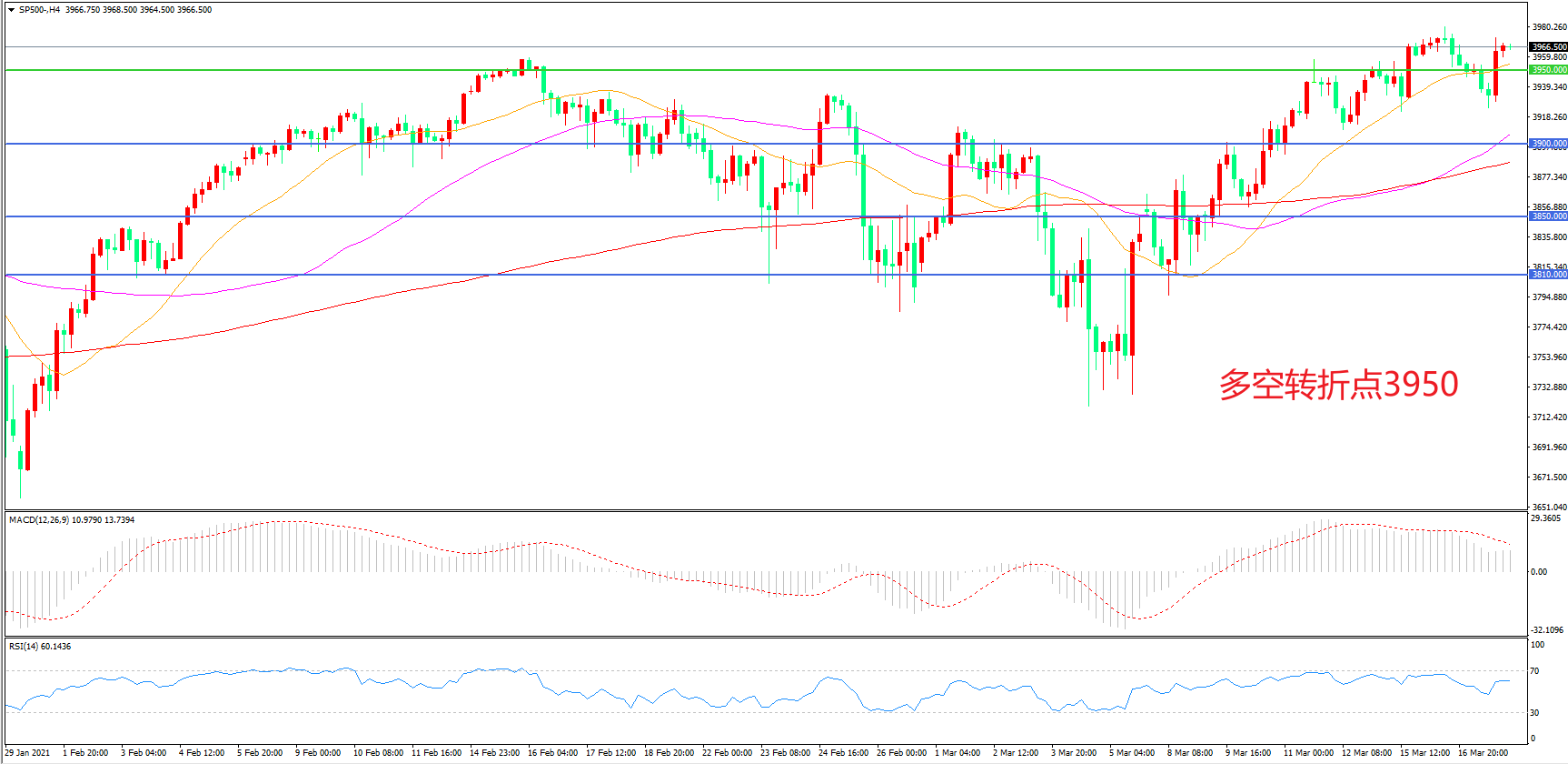 4小时图看,标普500震荡回落后长阳拉升,短期走势表现偏强,21周期均线系统成为下方支撑,3950成为多空分水岭,MACD红柱减少,RSI指标走平,日内震荡上行概率较大。