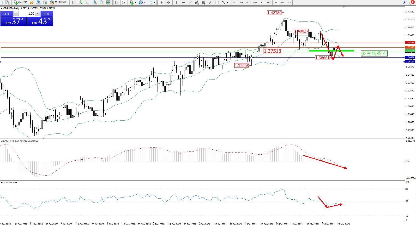 交易策略:1.37513下方看跌,目标1.36661、1.36114