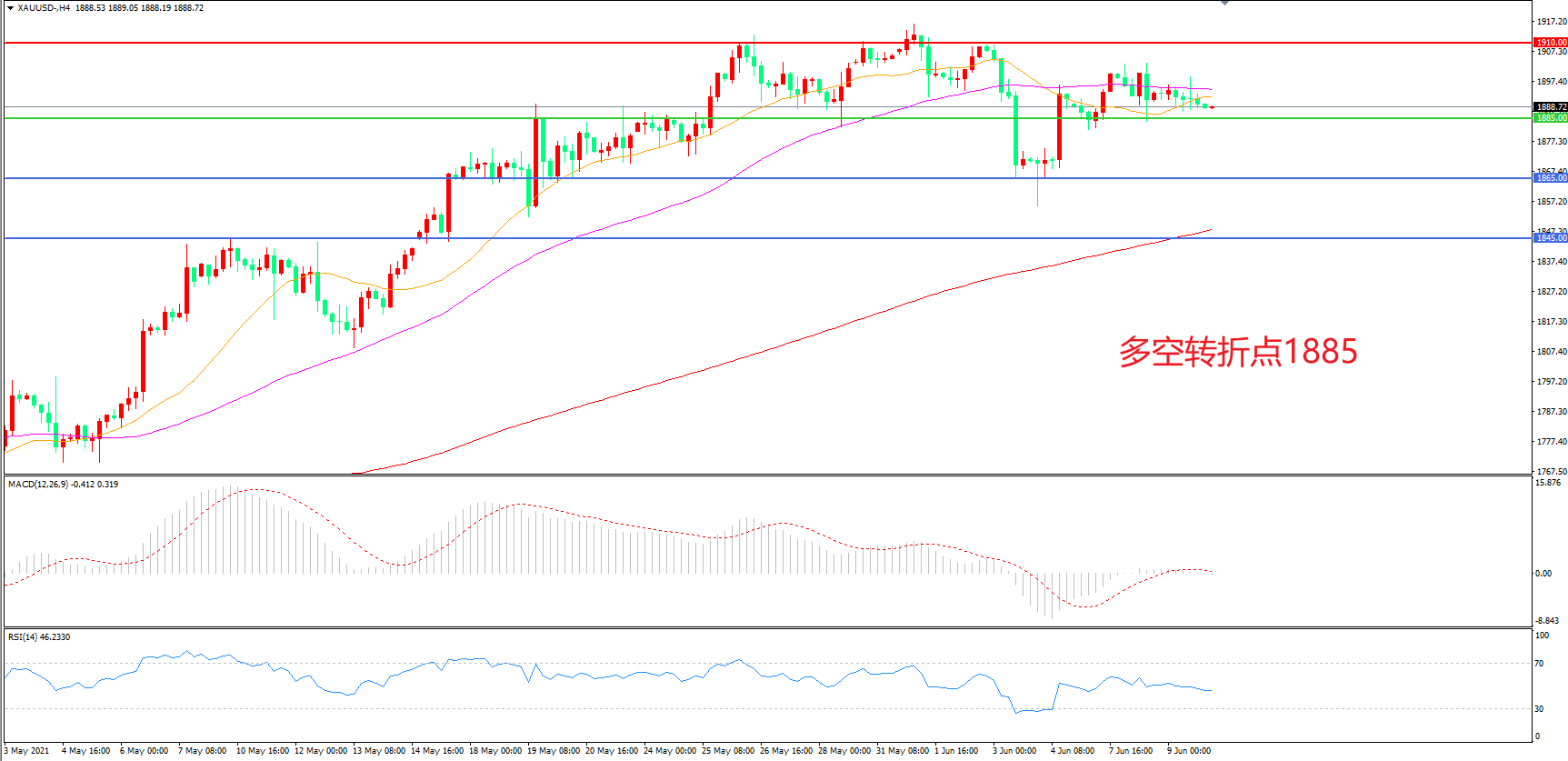 备选策略:在1885.00之下看跌,目标1865.00    1845.00