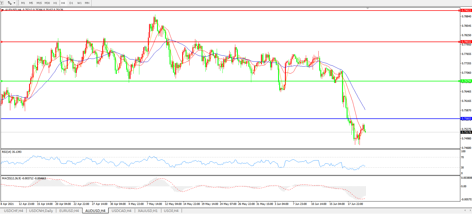 技术面简析:4小时图均线整体发散下行,汇价止跌反弹,MACD运行于0轴下方但量能开始缩量,RSI小幅走升,预计汇价大概率在反弹整理后进一步下行。