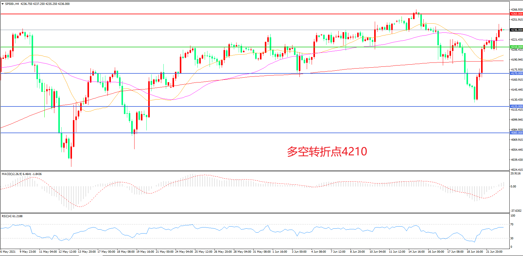 4小时图看,标普500回踩4210后大幅拉升,前期跌幅被快速收复,短线表现偏强,均线系统走平,MACD红柱增加,RSI指标走平,日内延续震荡概率较大。
