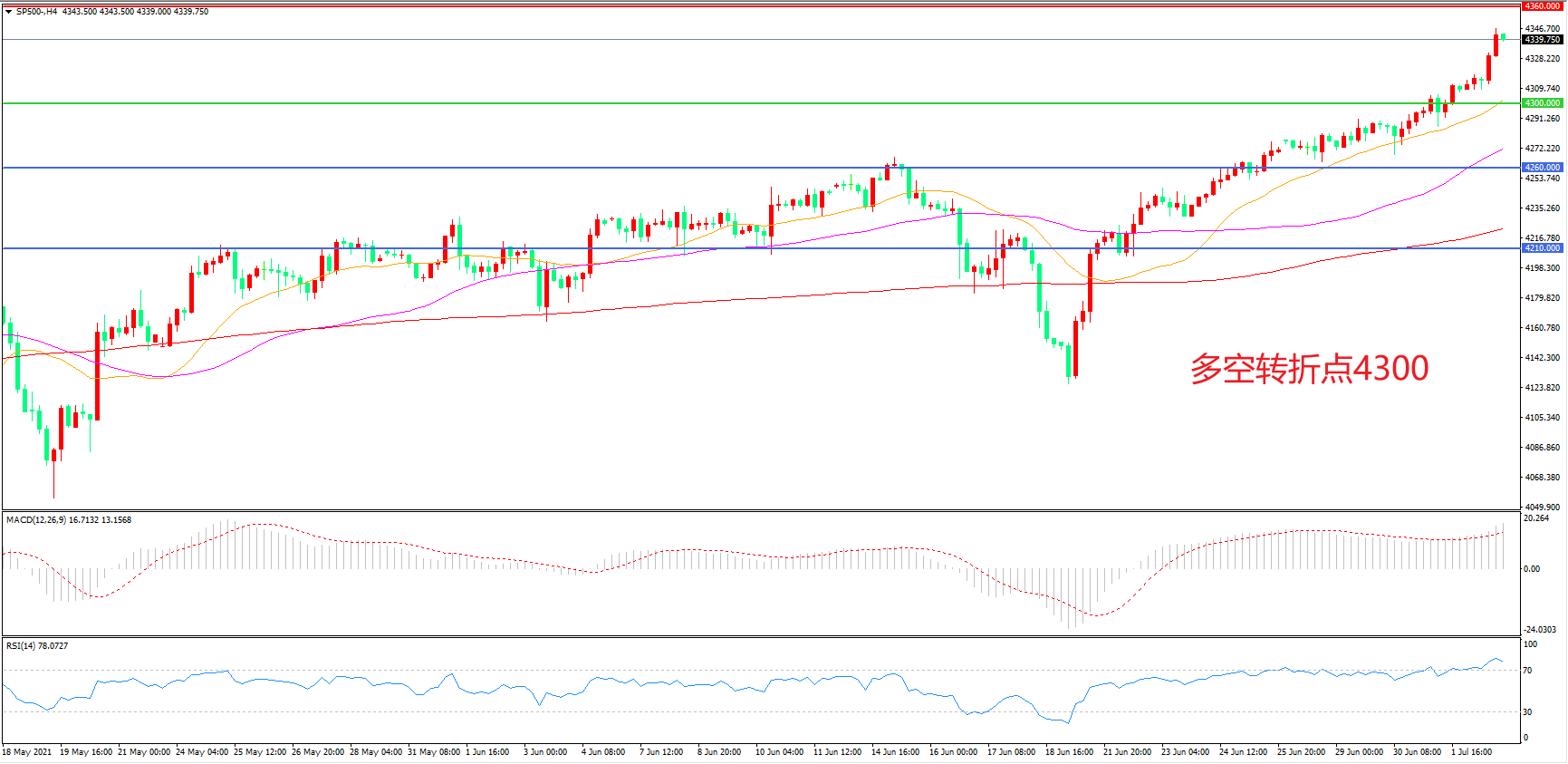 上周五(7月2日),美国6月非农新增就业人数增长85.0万人,远超市场预期,标普500大幅拉升,收报4339.75点。连续第七个交易日收创新高,为去年8月以来最长连涨日,并且是1997年来首次连续七日创新高。高于市场预期的就业增长速度表明,美国经济仍有增长势头,在其他条件相同的情况下,美联储不会面临迫在眉睫的加息压力,美股上行动力仍然充足。