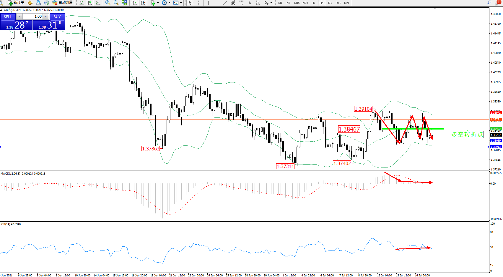交易策略:1.38467下方看跌,目标1.38099、1.37913