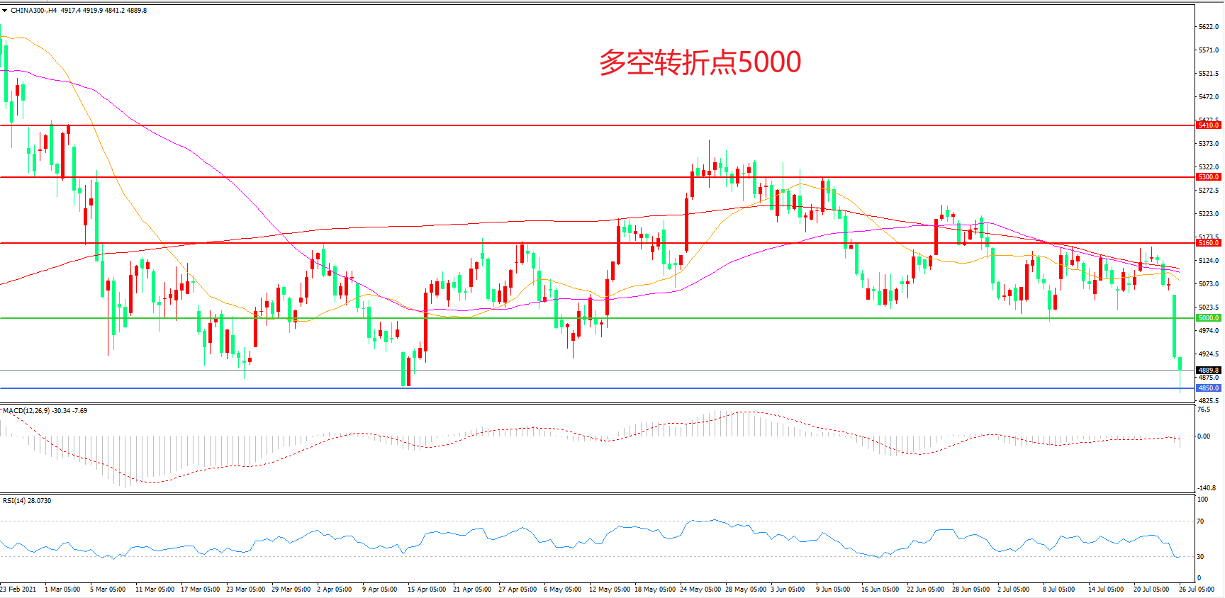 周一(7月26日),A股三大股指全线跳空低开,随后一路震荡走弱,呈现脉冲式下行格局,沪深300长阴下破,收报4889.8点。两市合计成交1.42万亿元,北向资金净卖出128.02亿。接下来会很明朗,要么是新一波大级别行情的开始,要么是退潮的开始,鉴于市场处于赚钱效应下降参与情绪谨慎的阶段,日内延续下行概率较大。
