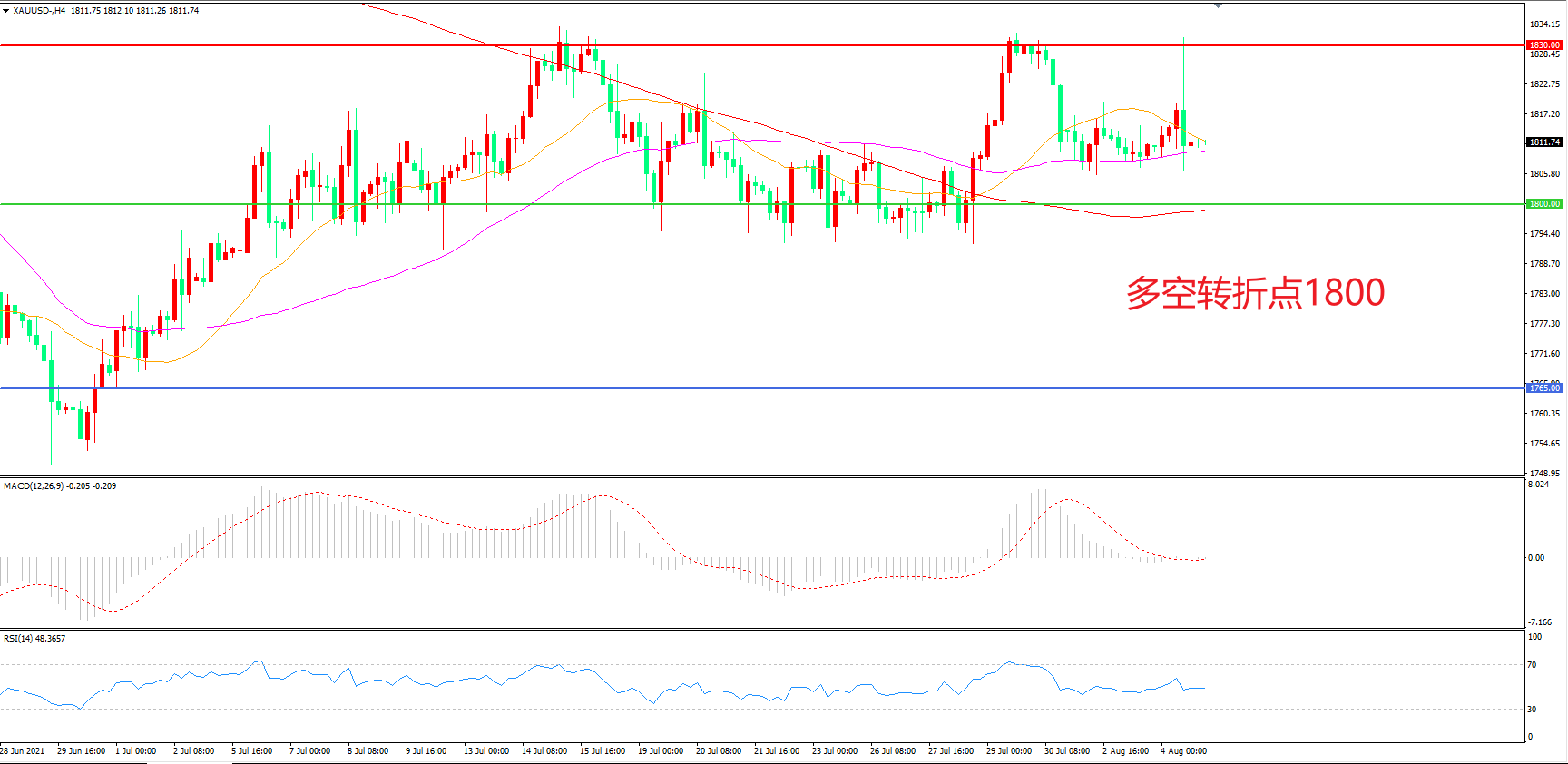 周三(8月4日),素有“小非农”之称的美国7月ADP就业数据公布,录得增加33万人,创下2月以来新低,COMEX黄金合约一分钟内成交2471手,交易合约总价值4.50亿美元,现货黄金一度大幅拉升后冲高回落,收报1811.63美元/盎司。如果周五晚间非农表现与此一致,金价将会迎来新的上升周期。
