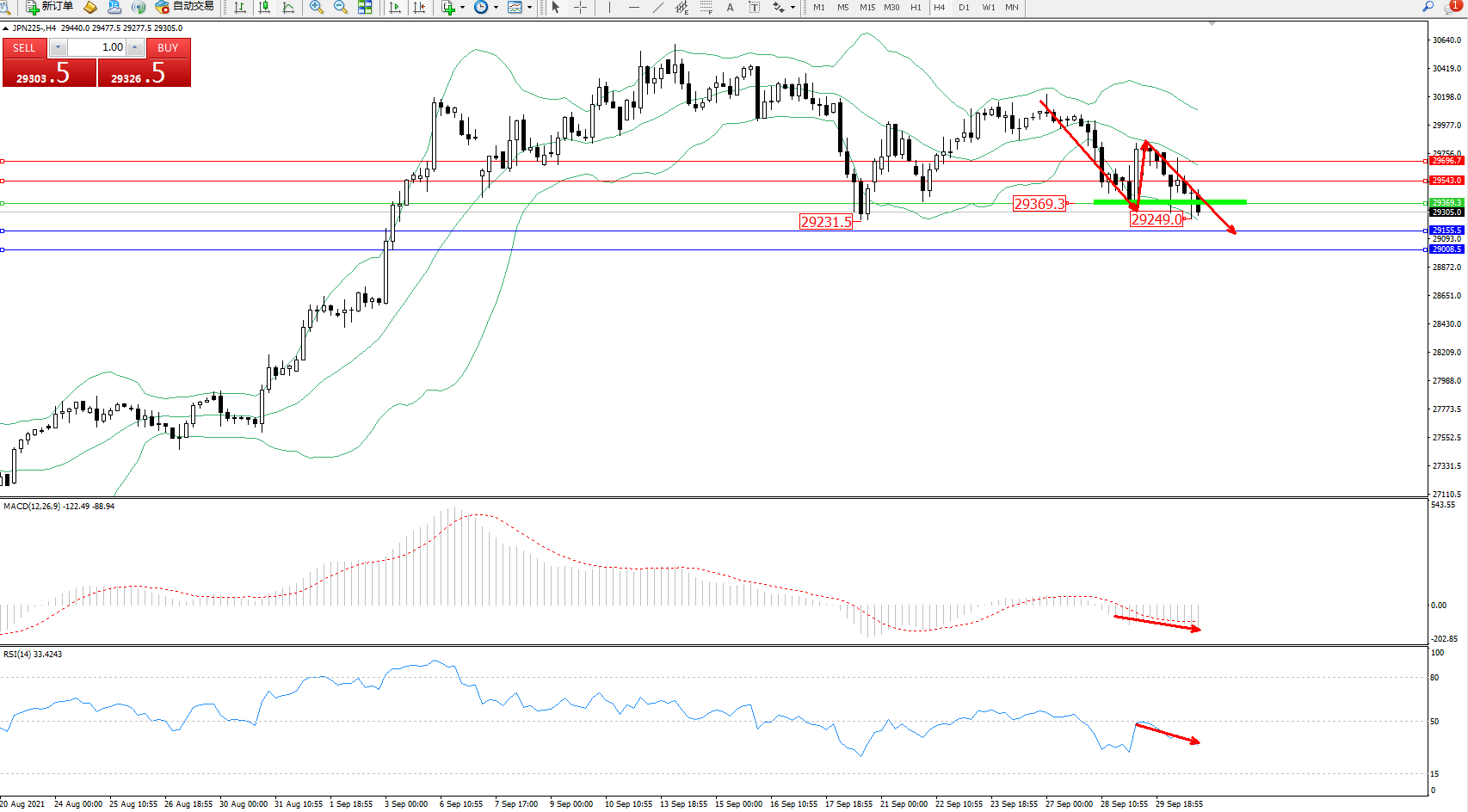 技术点评:空头动力延续布林带指标中下轨区间持续震荡向下移动,低位抵达29249位置后短暂震荡后有继续向下移动态势,布林带指标呈空头下行态势良好,短期未见止步迹象,MACD指标处于0轴线下方空头区域维持整理中,RSI指标处于50均衡线下方空头区域维持震荡向下移动中;