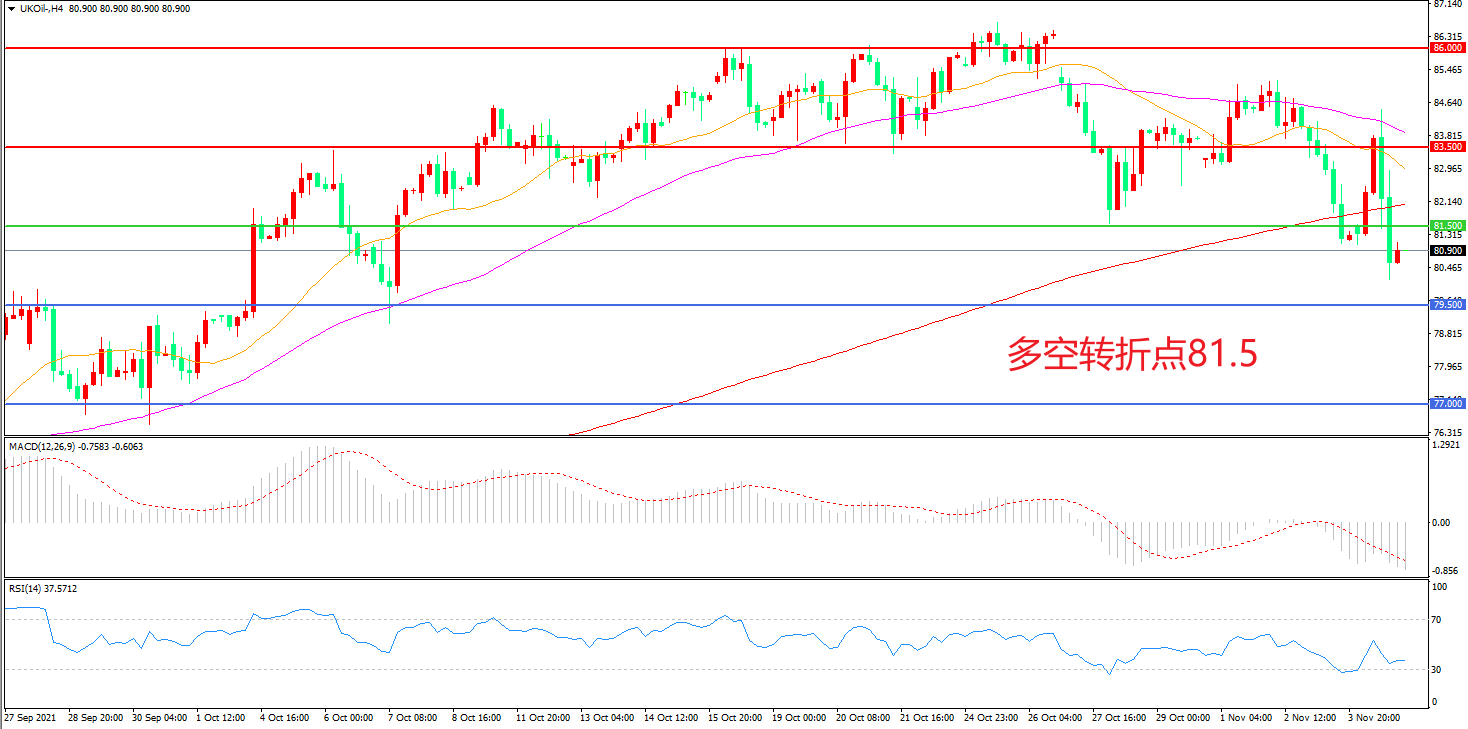 4小时图看,油价高位震荡后连续下破,整体表现低迷,83.5成为短期阻力,81.50成为多空分水岭,MACD绿柱增加,RSI指标走平,日内震荡下行概率较大。