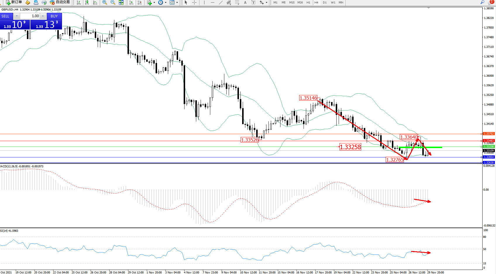 交易策略:1.33258下方看跌,目标1.32854、1.32630