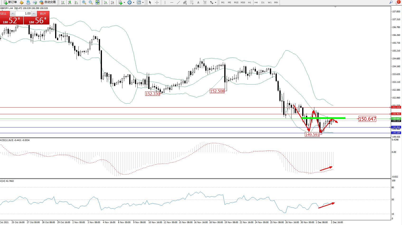 交易策略:150.647下方看跌,目标150.064、149.689