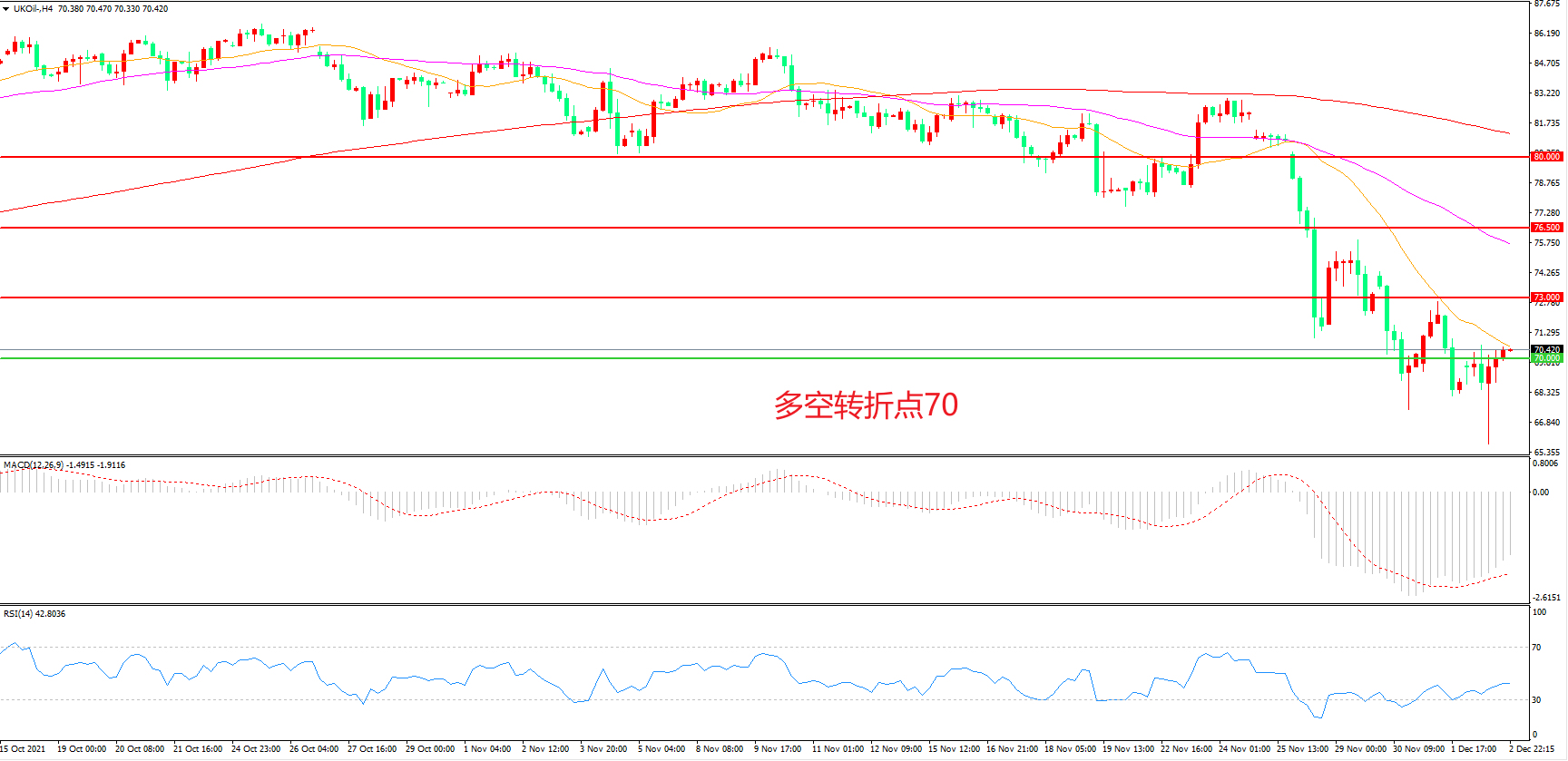 4小时图看,油价探底回升,短期走势有所回暖,但均线系统呈空头排列,70美元成为多空分水岭,MACD绿柱缩短,RSI指标走平,日内震荡下行概率较大。