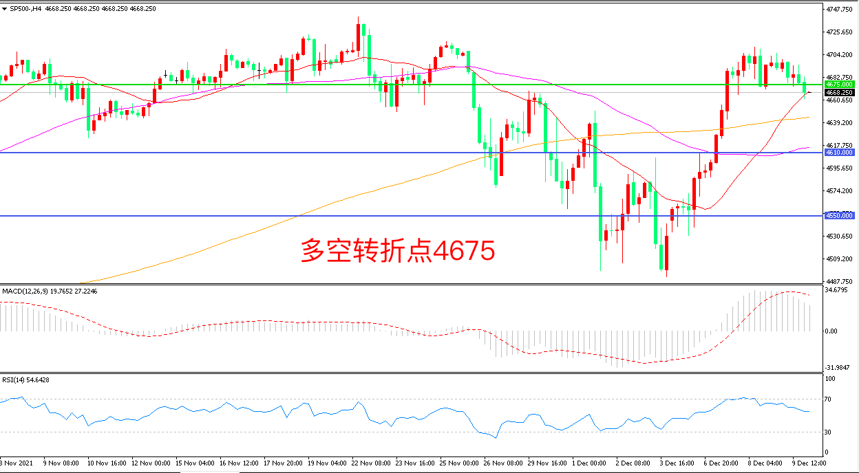 4小时图看,标普500长阳高位震荡回落,21周期成为短期支撑,4675成为多空分水岭,MACD红柱缩短,RSI指标走平,日内震荡上行概率较大。