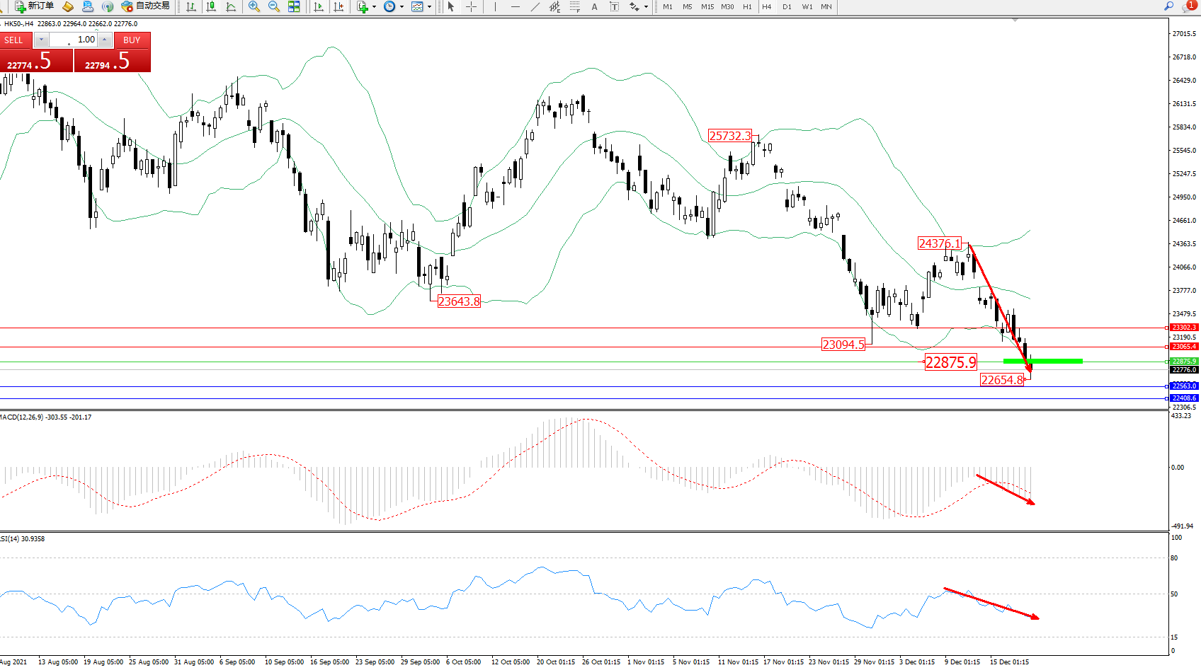 恒指HK50 ——4小时K线图显示:
