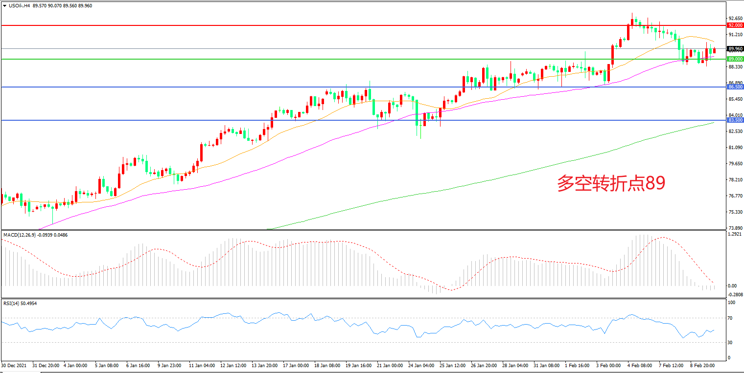 4小时图看,油价受阻于92美元后大幅回落,上行趋势暂缓, 89美元成为多空分水岭,MACD红柱增加,RSI指标走平,日内震荡上行概率较大。