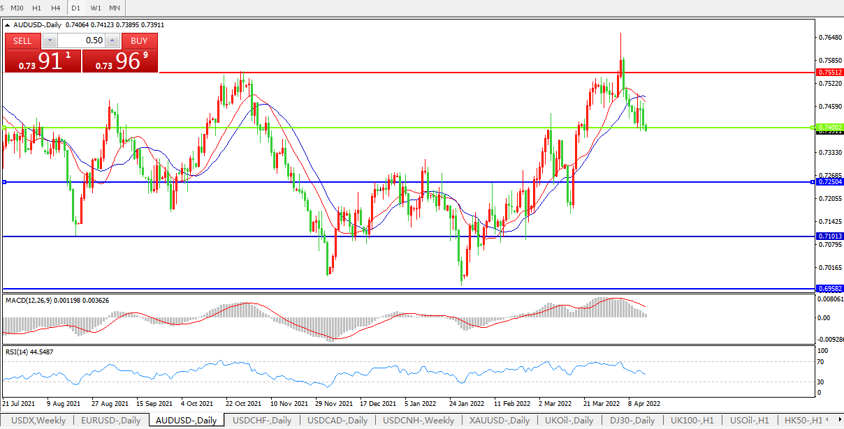 备选策略:0.7400下方看跌,目标0.7250、0.7100