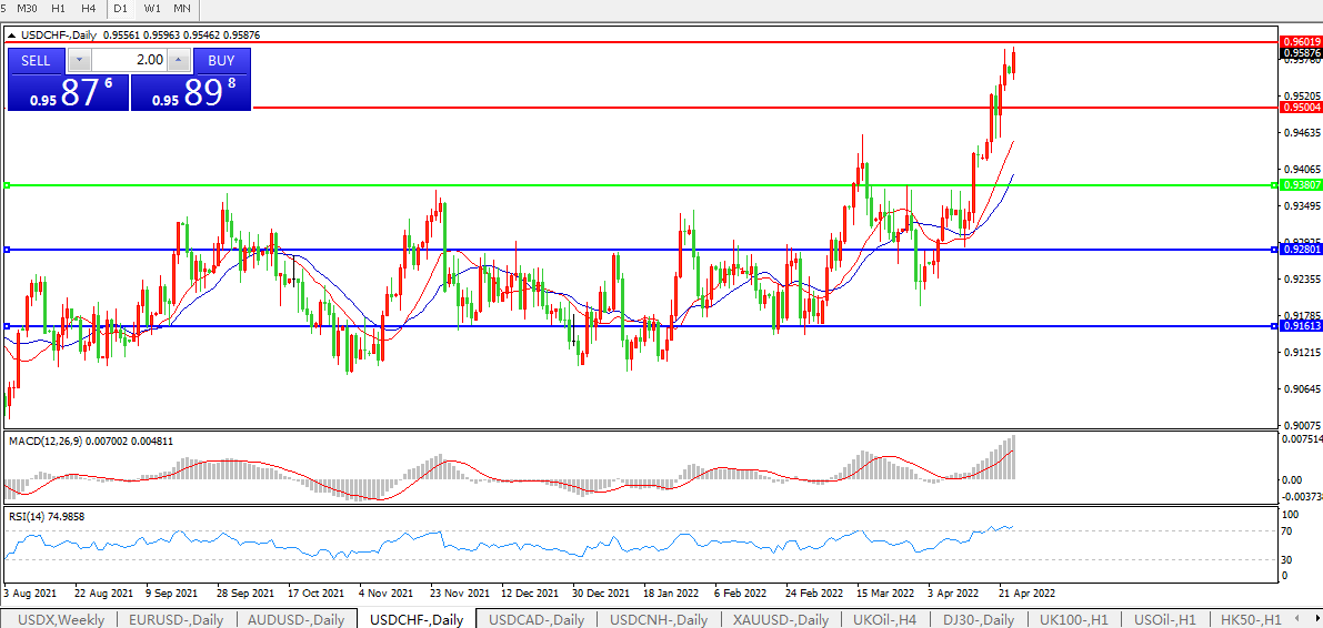 联储加息逐步落实,美元兑瑞郎直线拉升