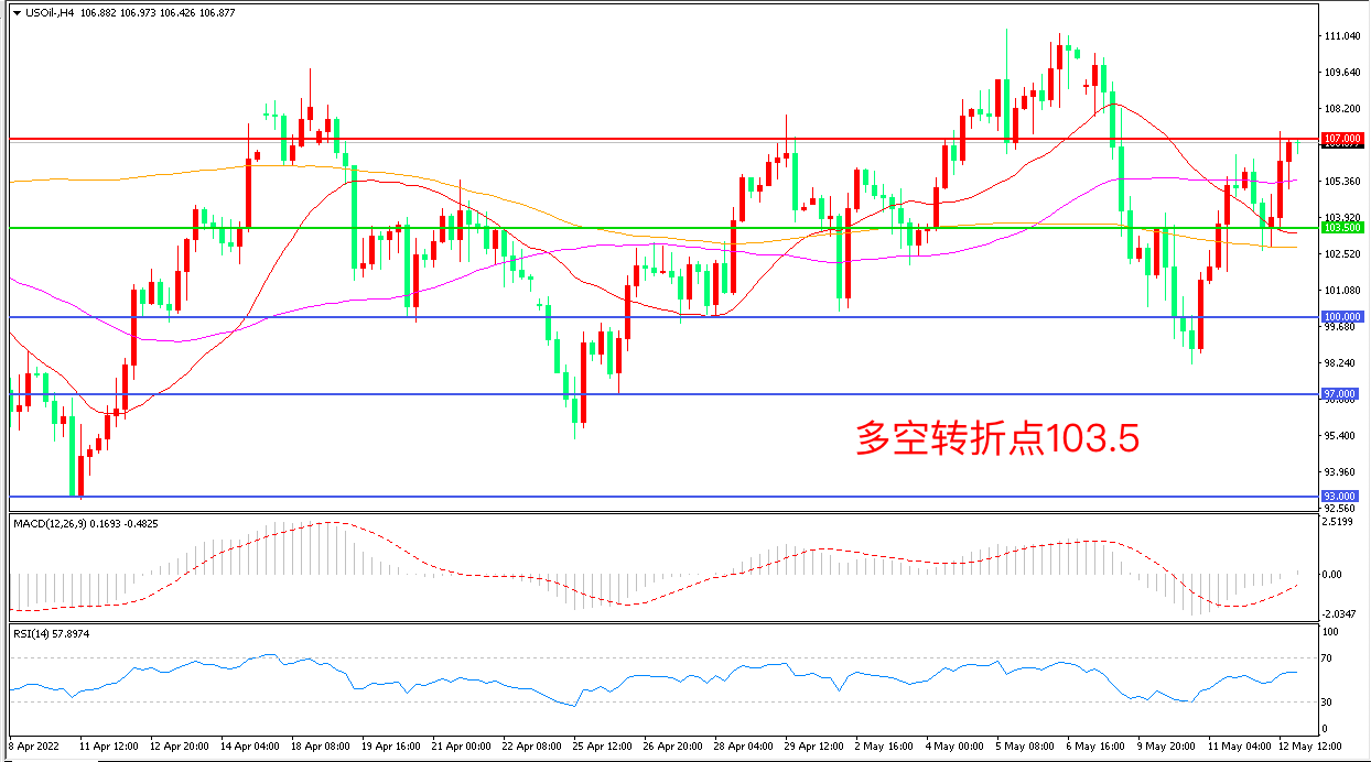 周四(5月12日),欧洲局势再度陷入紧张!俄罗斯外交部生产若芬兰和瑞典加入北约,俄将不得不采取手段消除可能的威胁,美国WTI原油延续强势表现,收报106.67美元/桶。短期看,油价仍处在多空因素交织的氛围下,因自身暂时并没有很强的下行驱动,而地缘因素及供应忧虑可能随时刺激市场,这让油价暂时难以摆脱高位区间震荡走势,投资者注意谨慎追高。