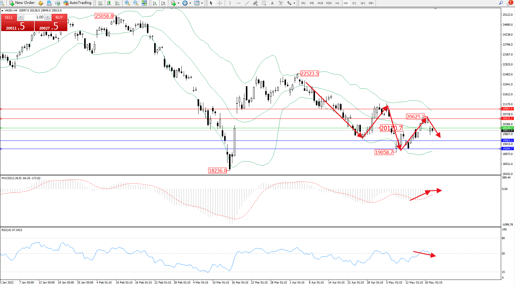 恒指HK50 ——4小时K线图显示: