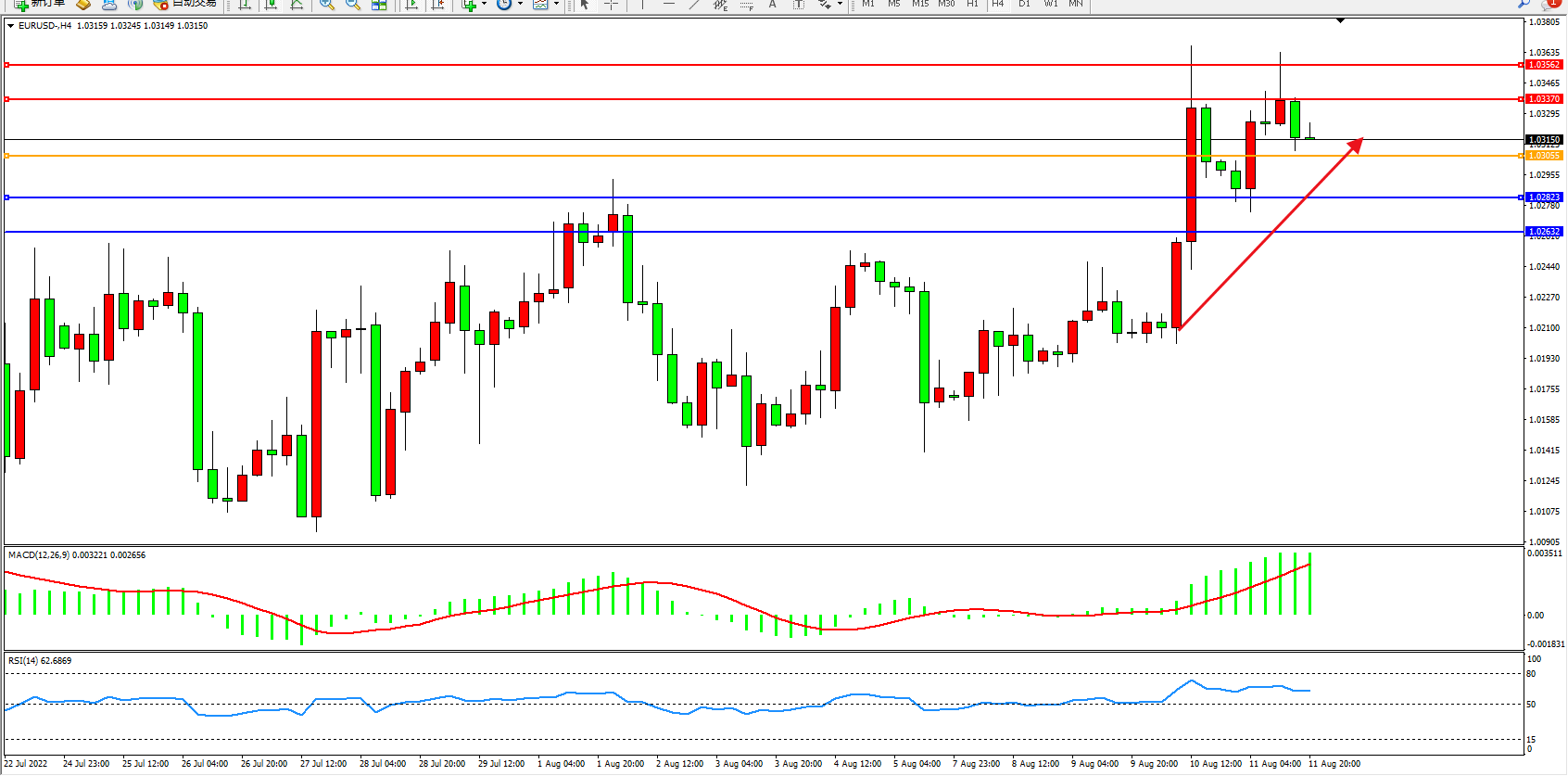 欧元美元EURUSD—4小时K线图显示: