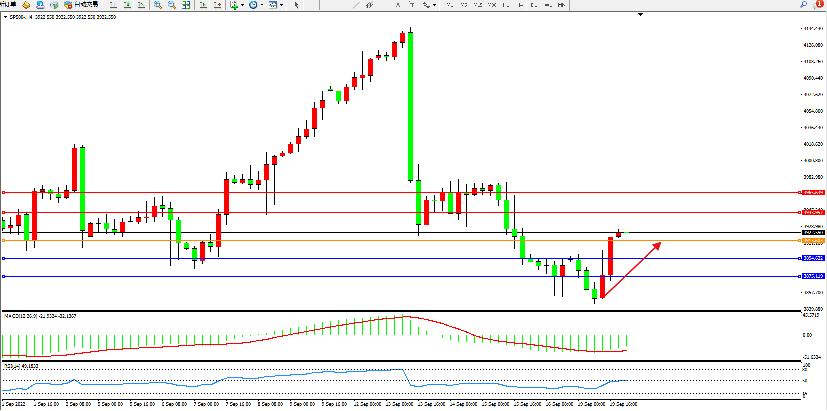 标普SP500——4小时K线图显示:
