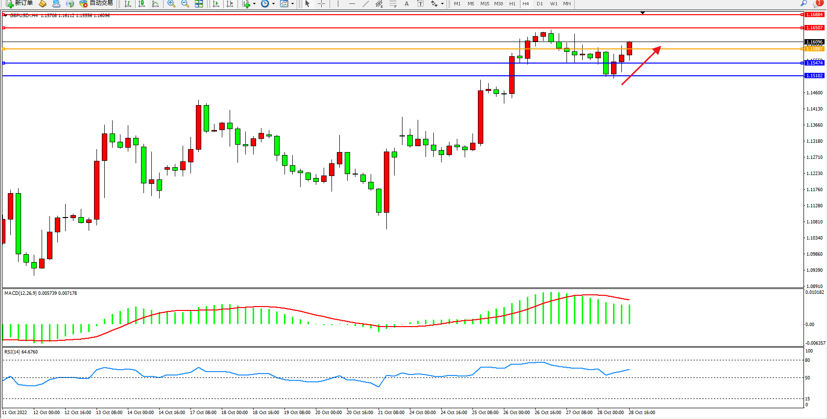 英镑兑美元维持1.16096附近震荡,市场普遍预计英国央行年底前将加息不到150个基点,但预计下周四(11月3日)将加息75个基点,将基准利率从2.25%提升至3%,以对抗居高不下的通胀。市场对英国央行更大幅度地加息100个基点的预期也上调至37%,高于推迟公布财政规划前的概率。